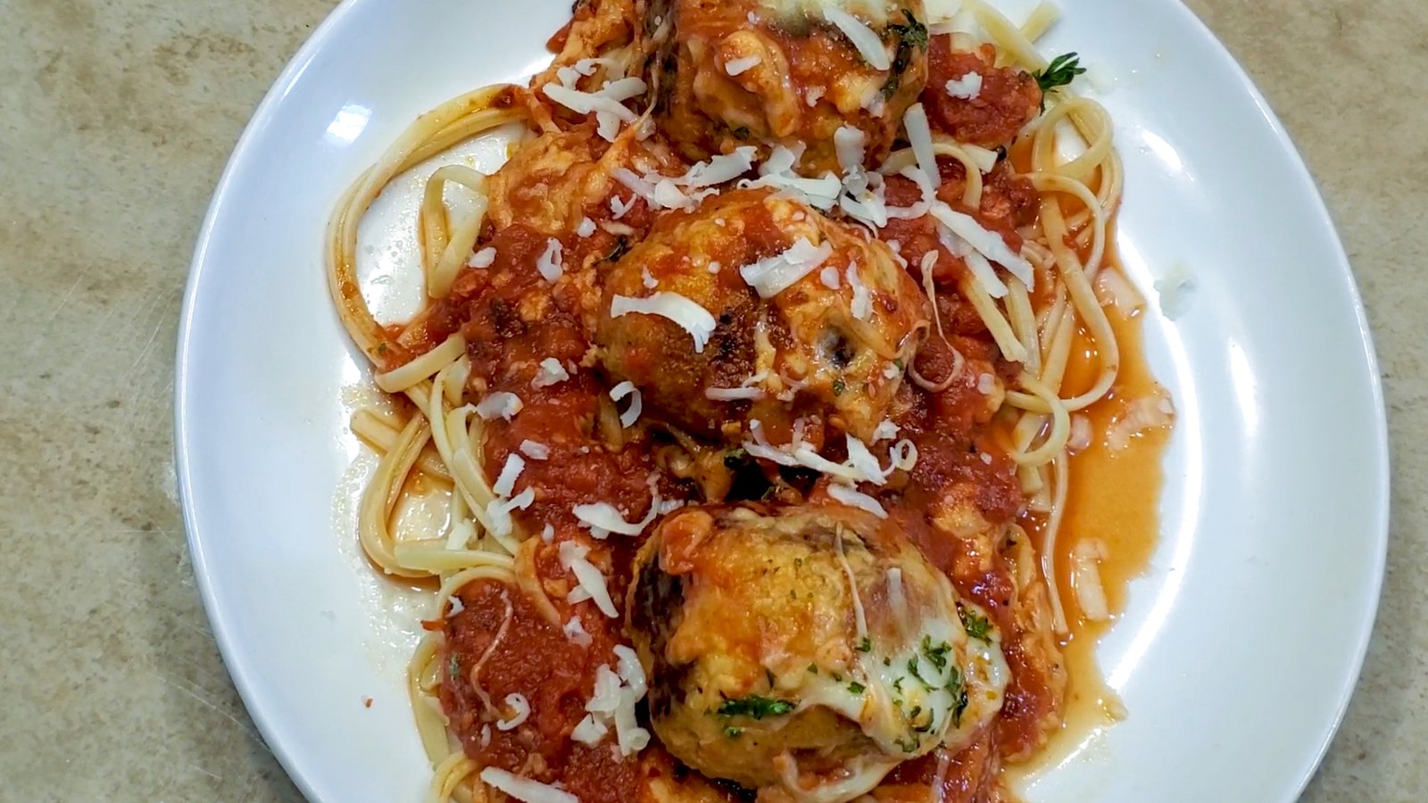 Chicken Parmesan Meatball Bake over Linguine