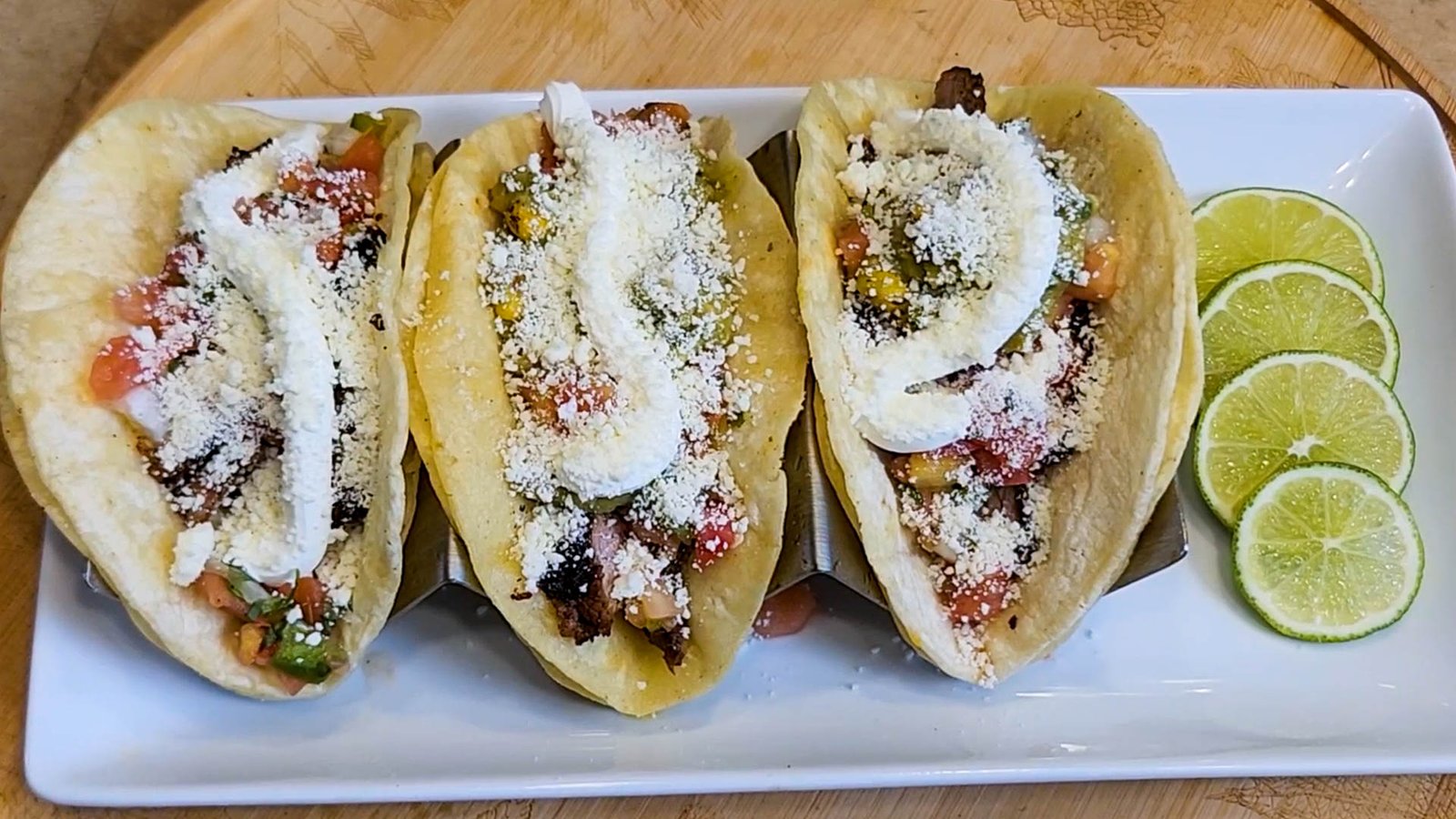 - Assemble tacos by layering steak followed by pico de gallo, Guacamole, sour cream and cotija cheese.