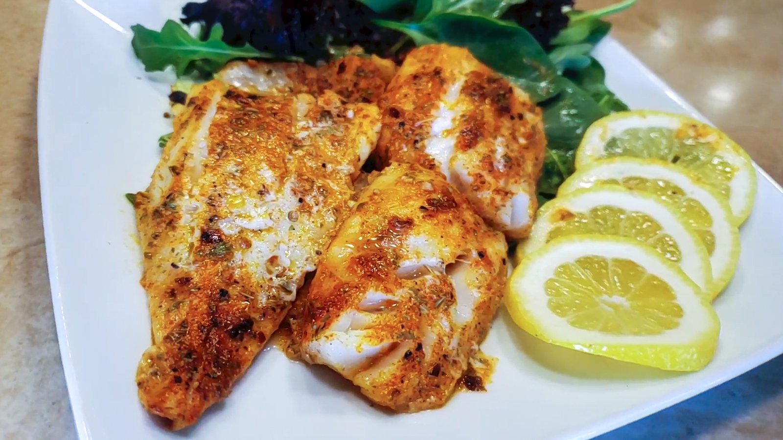 - In a small bowl mix all seasoning ingredients together and cover all sides of fish generously.