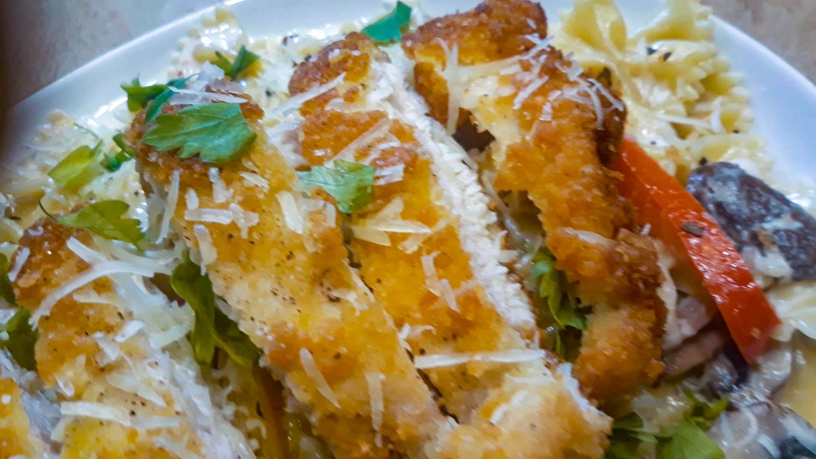 14. Slice chicken into slices to cover pasta mix and top with more Parmesan cheese