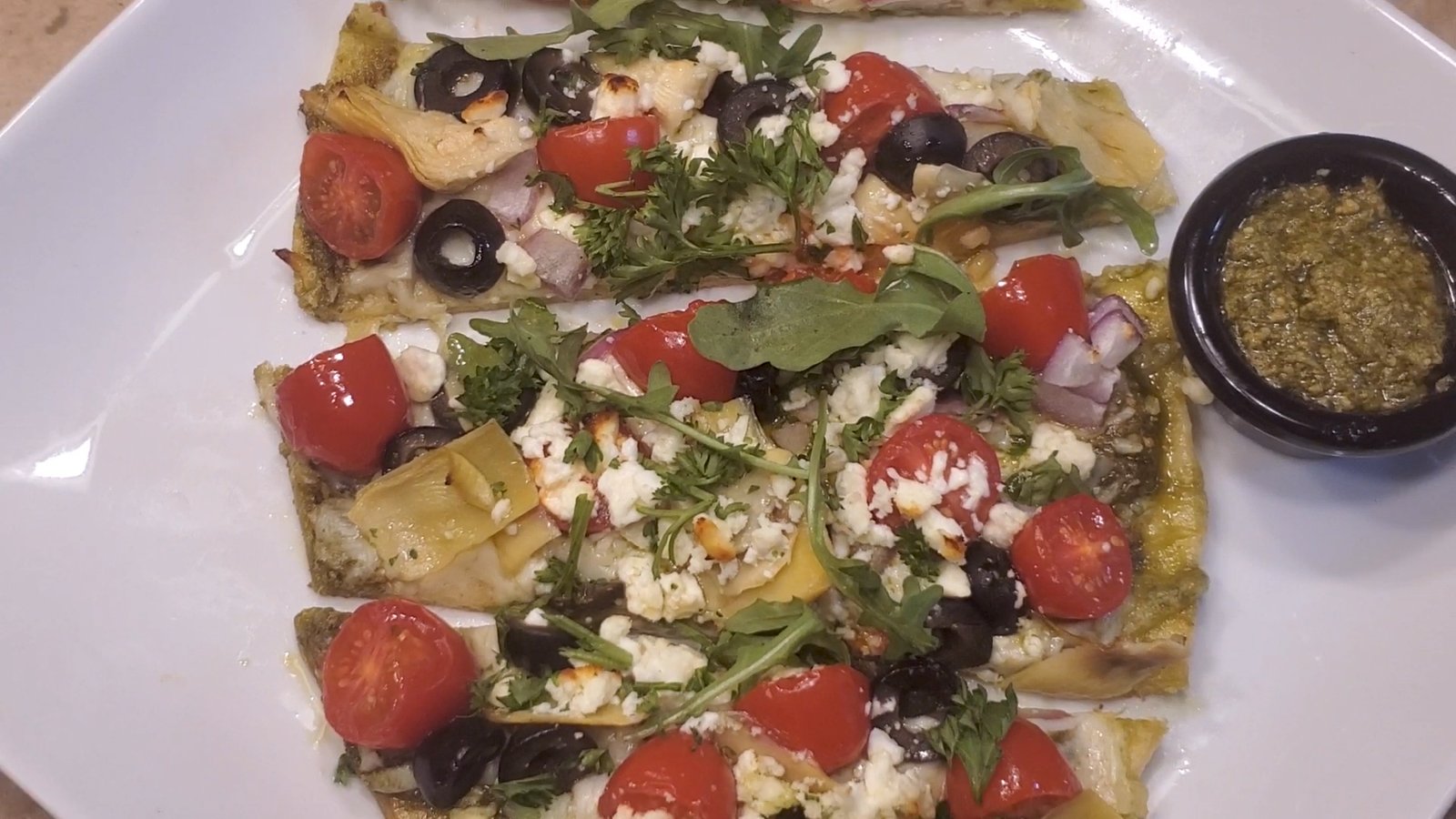 - For the Mediterranean toppings, we add tomatoes, onions, olives, artichokes, and feta