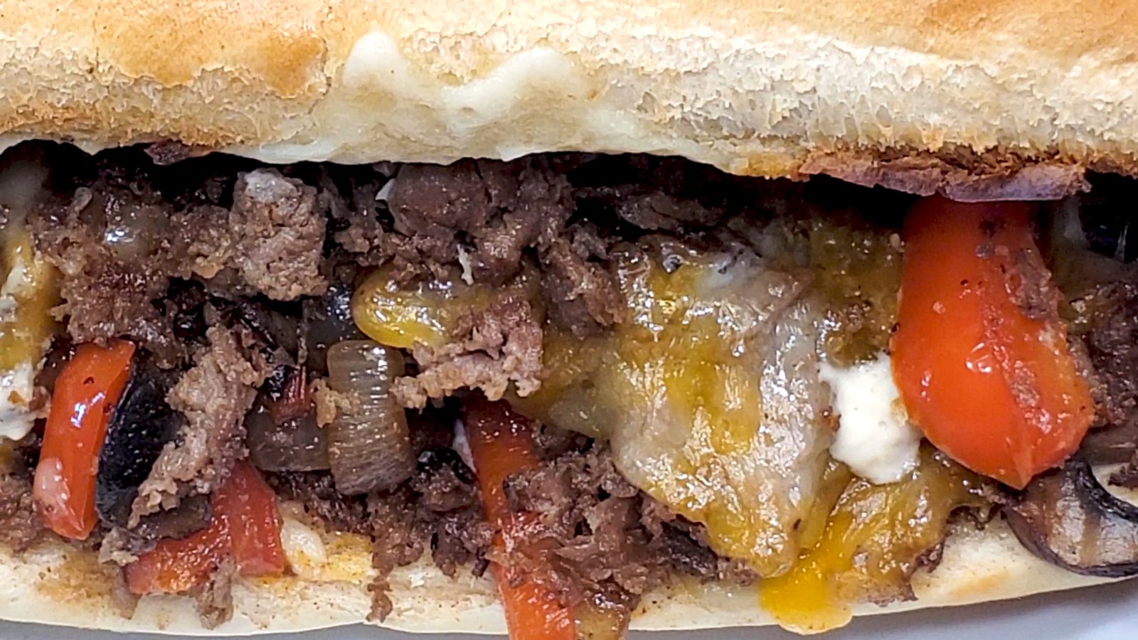 - Build sandwich with 2 pieces Mozzarella or Colby on bottom bread, layer steak, onion red pepper, mushroom blend.