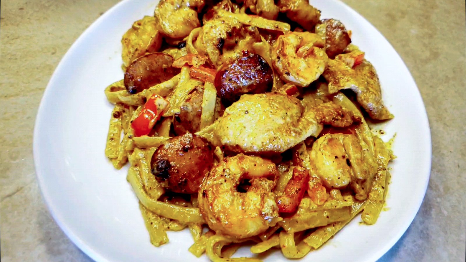 Take your favorite fettuccine pasta and pack it with a variety of well seasoned meats and you've got Kenny's ultimate pasta. Kenny adds Andouille sausage, shrimp, and chicken all seasoned with a spicy blend and combines it with a creamy sauce to round out this Ultimate pasta plate. Enjoy
